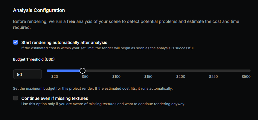 Before submitting your render job, an analysis step is performed (this applies only to animation projects). This step allows you to validate your scene, estimate costs and render times, and catch potential issues early.